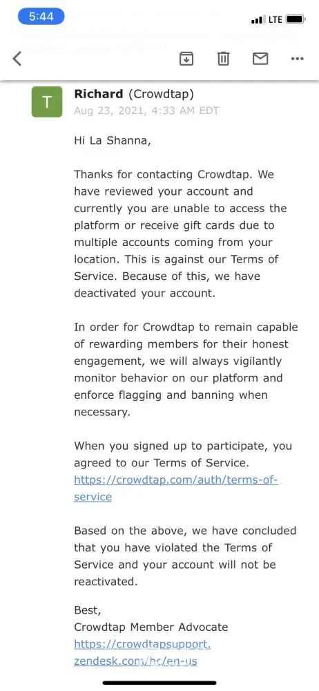 I have been a member of crowd tap for quite awhile. I was in middle of doing a survey, when internet went out. When I came back to it, it said that my account was disabled. I sent email and the only thing I was told was that I had violated terms of service, but not which one. I had over $45 in points. This seems like a shady and underhanded way to do business. Please help me get this corrected asap!