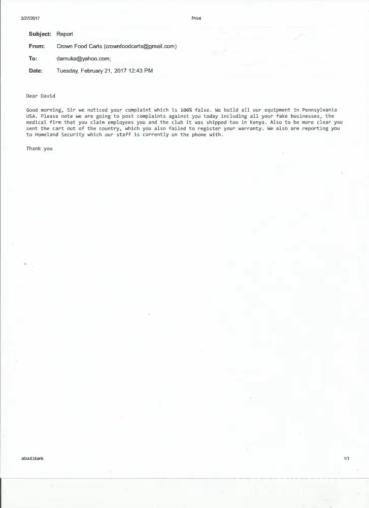 Read full complaint and 2 commentsOverview of Crown Food Carts complaint handling