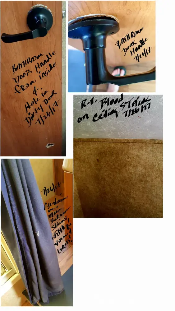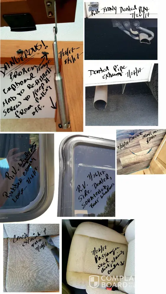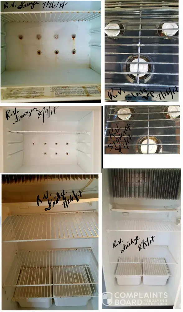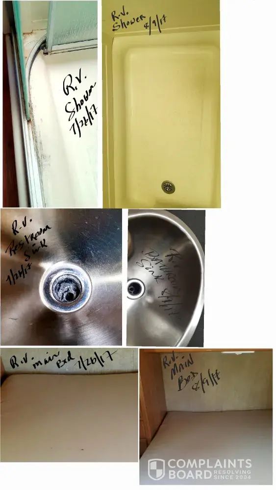 It was a huge distraction in my spending time with my family and added expense buying cleaning supplies, tools needed to fix a broken cupboard (dangerously falling onto my daughter's head), shower unusable (broken doors wouldn't stay closed), hole in restroom door, bathroom door knob broken (barely hanging on door), bathroom sink drain filled with dirt & hair, all curtains dirty and stained, light on black water indicator doesn't work (Which caused a full black water tank filling the toilet bowl backing it up), refrigerator & freezer disgusting, blood stains on ceiling, burnt mark on floor, scratches on most cabinets, cut mark on table, trim falling off edges of table seats and couch, main bed cover dirty stained gross, torn material on couch seat, black stains on cab seats and couch, dirt covered air filters in a/c unit(* so filthy it caused my daughter to have a Asthma attack), a crack in windshield, dented side of R.V., scratches on driver mirror, upper bed window screens broken (allowing mosquitoes in, we all have numerous bites), outside storage compartments never stayed locked, dirty floors, dirt crumbs & tic tacs all over driver's cab, loose curtain rods,