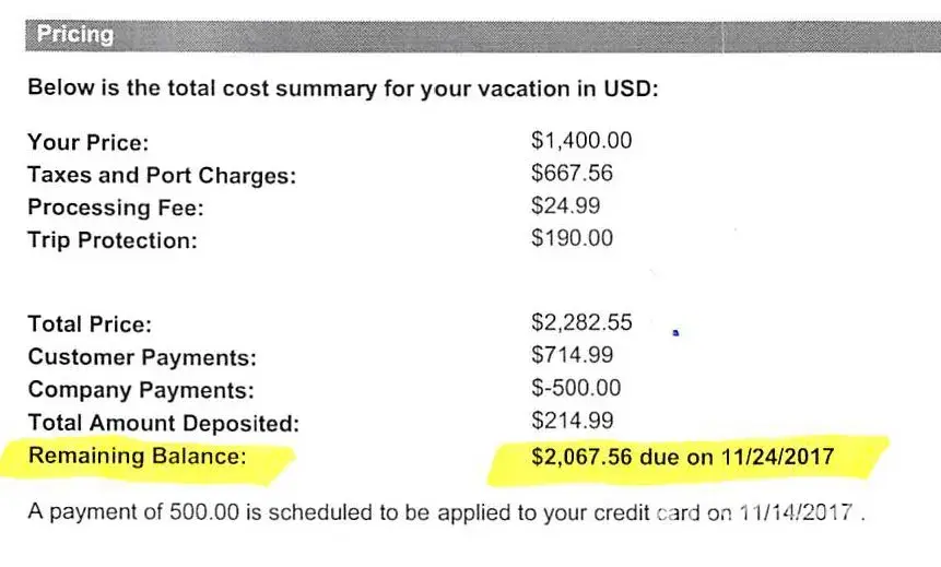 $214.99 was prepaid in June, 2017. The invoice and confirmation indicated that the remaining balance of $2, 067.56 was due on 11/24/2017. This is in conflict with the $500 "company payment" which was to be applied to my credit card on 11/14/2017. If $500 was to be deducted on the 14th, then only $1, 567.56 would be due on 11/24/2017. Yet, in bold type, the invoice and confirmation indicated the remaining balance of $2, 067.56 was due on 11/24/2017. Since the credit card I had used for the prepayment in June had been closed due to fraud on the account.