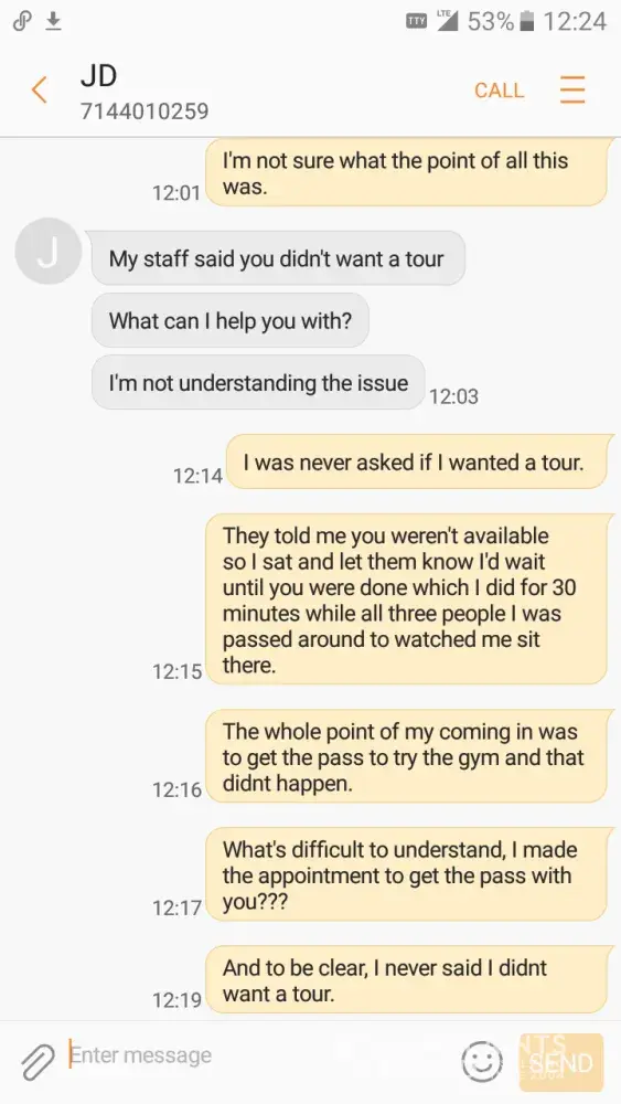 I followed up with the JD, GM of Crunch Sunset, and scheduled an appointment at 11 AM. I arrived at 11 AM and was ignored by the front desk staff for about 5 minutes while I was standing waiting for one of the two guys working to ask me if I needed help. They were too busy having a conversation until I interrupted them to let then know I was there for an 11 AM appointment.