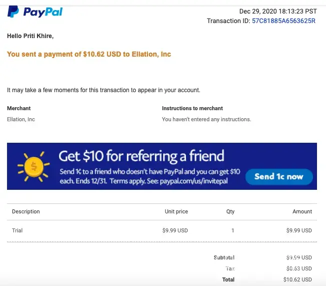 I received a paypal notification that $10.62 had been sent to Ellation, Inc. From what I remember, I haven't purchased anything from this company. I don't have a Crunchyroll membership either, so I can't imagine what it's for. I believe I cancelled the payment through Paypal, but I'd like to confirm it's been cancelled. I have the Paypal transaction ID: 57C81885A6563625R. I hope this helps with location the information. I'd like to know what this transaction was for and I'd like to make sure the payment was cancelled. Thank you.