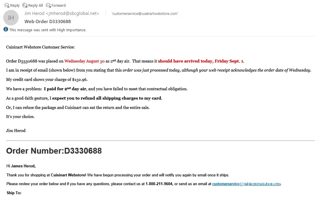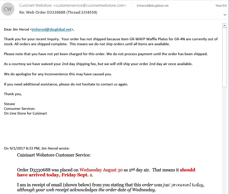 On Sept. 1 we get email stating that the order was being "processed." I write the web order customer service and complain about response time and state that Cuisinart didn't fulfill the terms of the order. Rep states in email that one of the items was backordered and that they don't ship partial orders.
