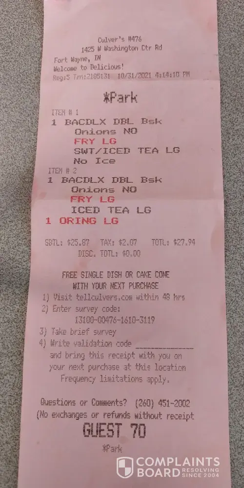 I am writing concerning the meal I received on 10/31/2021 at the W washing ctr rd. Fort wayne In location. Our food was cold and made my husband sick. We had to wait for about 20 minutes and our hamburgers were cold, the french fries was cold. Culver's #476, 1425 W washington Center Rd. fort wayne Indiana. Guest #70 at 4:14:10 in the afternoon.