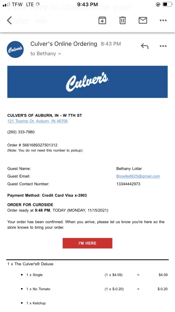 We went to Culver's restaurant at 6:38pm we watched everyone get there food and leave 25 minutes later we got someone and ask them where I food was they said pull around front and 10 min brought us a bag of food after waiting so long we never checked our back our chicken sandwich was missing our French fries were missing and our Pretzel bites the only thing we got was butter double burger and sourdough Double Burger We called the store (771 and talked with manager Nick only thing he could say was they were busy not that he would get our food we want our money back for items not given to us the total was 26.14 and since we only have bag ticket we don't know price of items thanks to your incompetence one of our family members had to find something to eat this is not the first time this has happened but will be the last time you leave out food make us wait long times for food it was so much better in Wisconsin when we were on vacation we do not have money to throw away this should never happen and you need to train your manager what not to do you should take a close look at this restaurant (reg :5 trn: 418774 guest [protected]