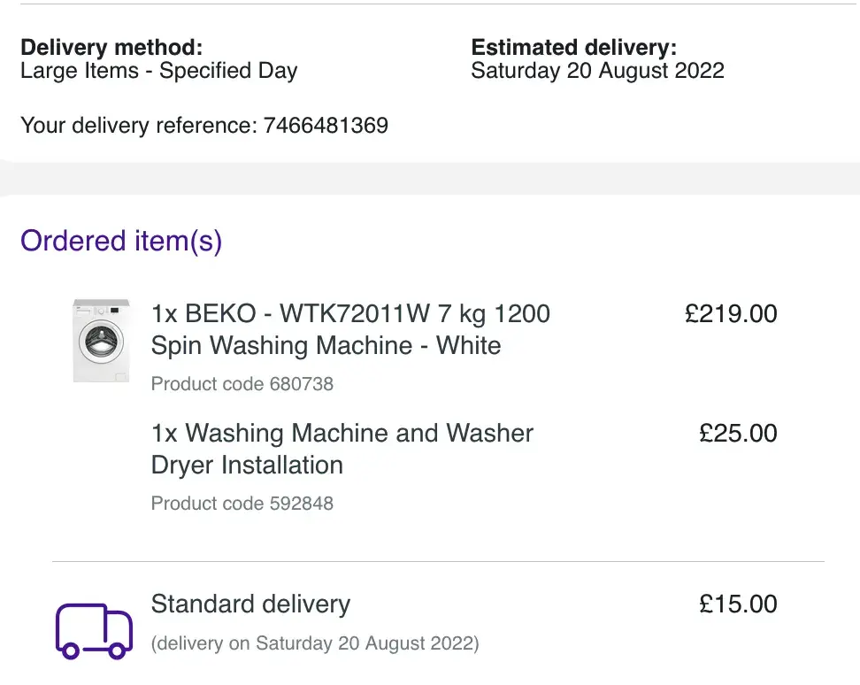 I ordered a Curry’s Essentials dishwasher on 11th July 2022. The product was initially delivered to us on July 20th. Unfortunately, the delivery was extremely stressful and late. Myself and my partner were working and out of town on the date of the scheduled delivery, so my partner’s mother waited at our home for the dishwasher to be delivered. However, the delivery arrived several hours after it was scheduled, being originally advised that the delivery would be made no later than 1:30pm, and was eventually delivered at 5:30pm on that day, causing much disruption to my mother, who is in her 80s.
