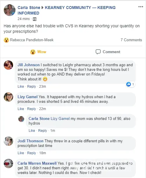 I personally do not have a complaint, but the CVS Pharmacy in the town I work in has had several complaint about not getting all of their qty of prescribed pills on Hydocodone. At first I thought it was just maybe an abuser, but when several others jumped on board I wondered if maybe the Kearney, MO 64060 store might have a problem with one of their employees taking the medicine. Here is a screen shot