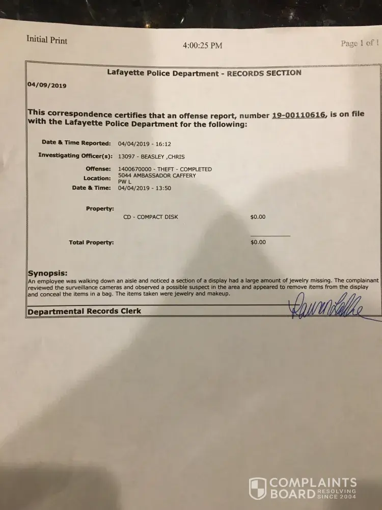 Please see the attached police report regarding a reported incident on April 4, 2019 at the CVS store # 8958 on 5044 Ambassador Caffrey Pkwy in Lafayette, LA.