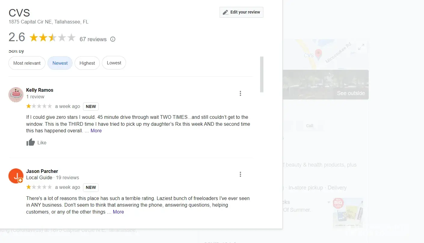 CVS earns a 1.3-star rating from 42 reviews and 3354 complaints, showing that the majority of pharmacy shoppers are dissatisfied with their purchases and service.
