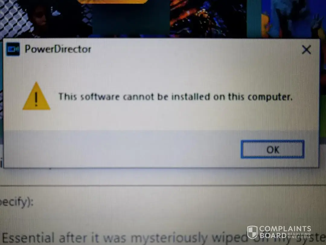 My Power Director software was mysteriously wiped off my system. I've tried re-installing but fails (see attachment). On messaging this, your tech helpdesk (Lilian and Mike) have completely ignored my request for someone to contact me. And they kept repeating the same messages telling me to go through the same process which isn't working.