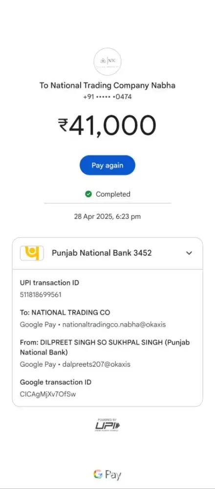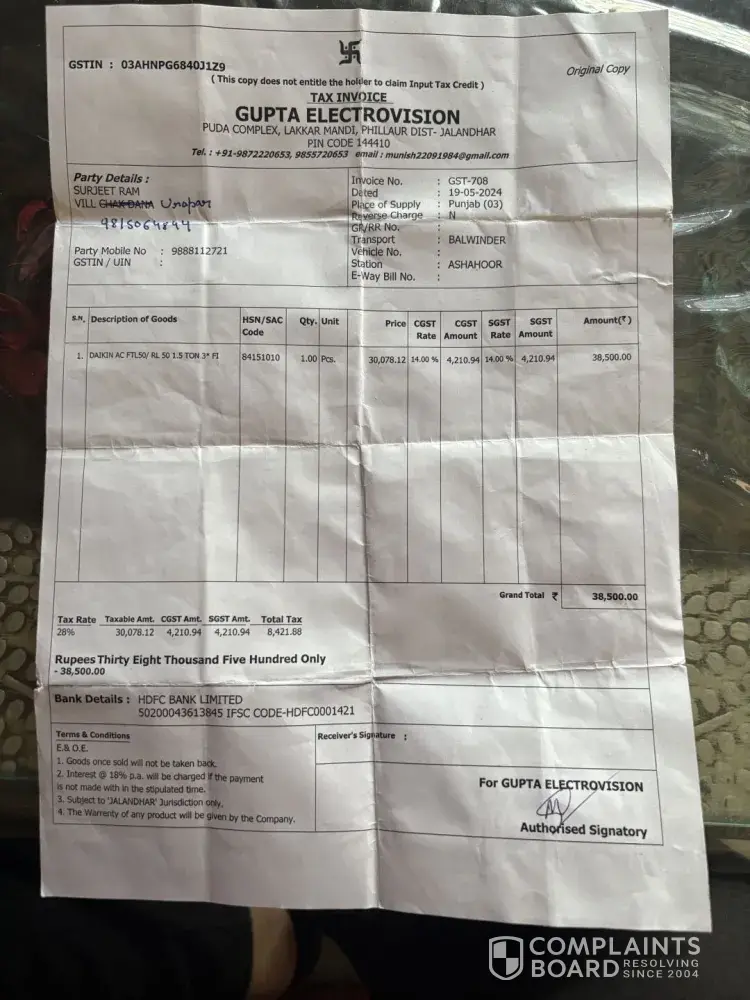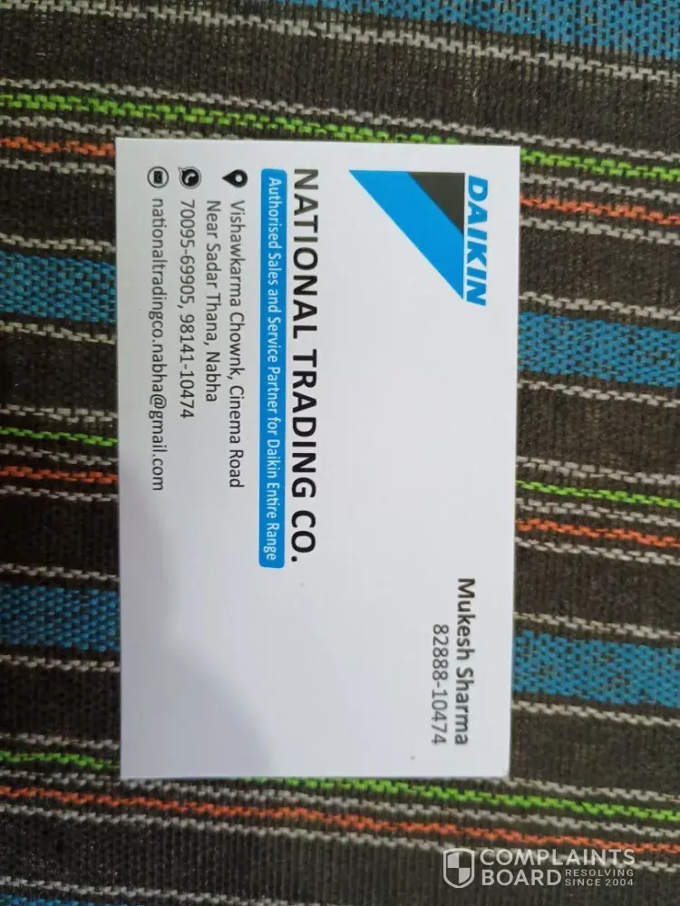 Complaint against authorised sales and service partner for entrie range nabha, authorised dealer is national trading co. (Mukesh Kumar [protected], [protected]) Purchase and payment date 28.04.2025 1. Not picking calls after payment for product dilivery 2) not providing invoice, 3) not providing original accessories