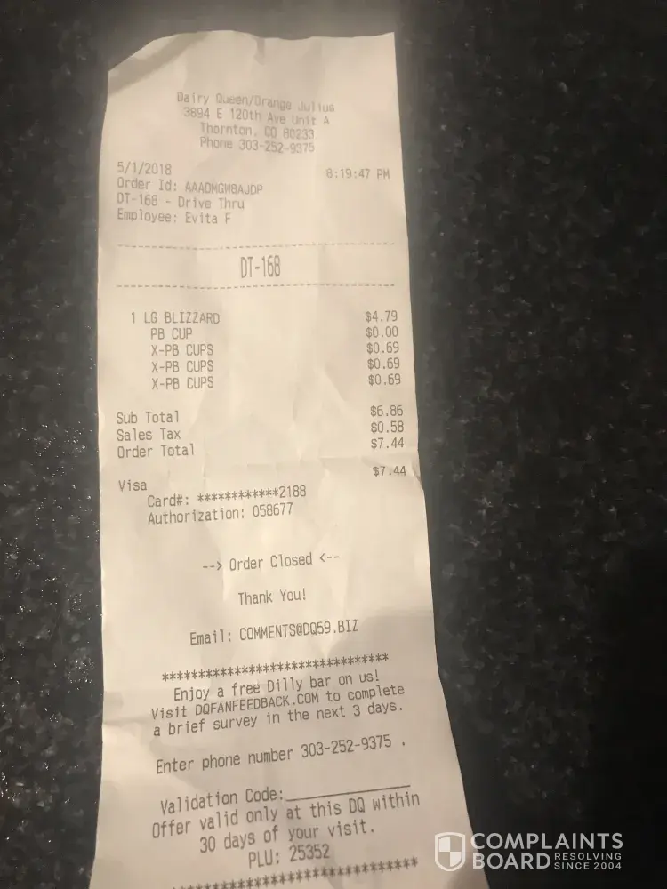 I am contacting you on the topic of an order I received from the Dairy Queen located at 1245 PA-315, Plains Township, PA 18702 on January 5th, 2018.