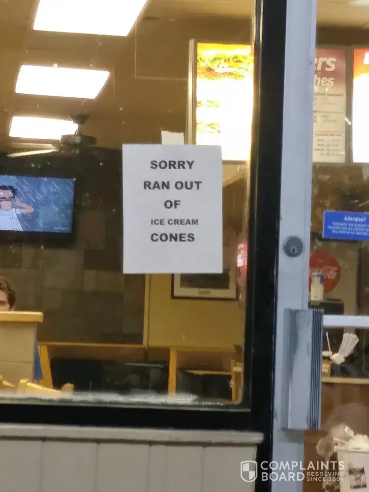 Not enough cones at dq.They ran out and the Dickinson dq would not accommodate us with just their ice cream.We didnt ask for much just a little ice cream in a cone.I feel like if they ran out of ice cream thats one thing.We asked them if they could put some ice cream in a cup and they told us no.Bad service.They had a bad attitude.The sign says to contact Joe for comments and complaints.