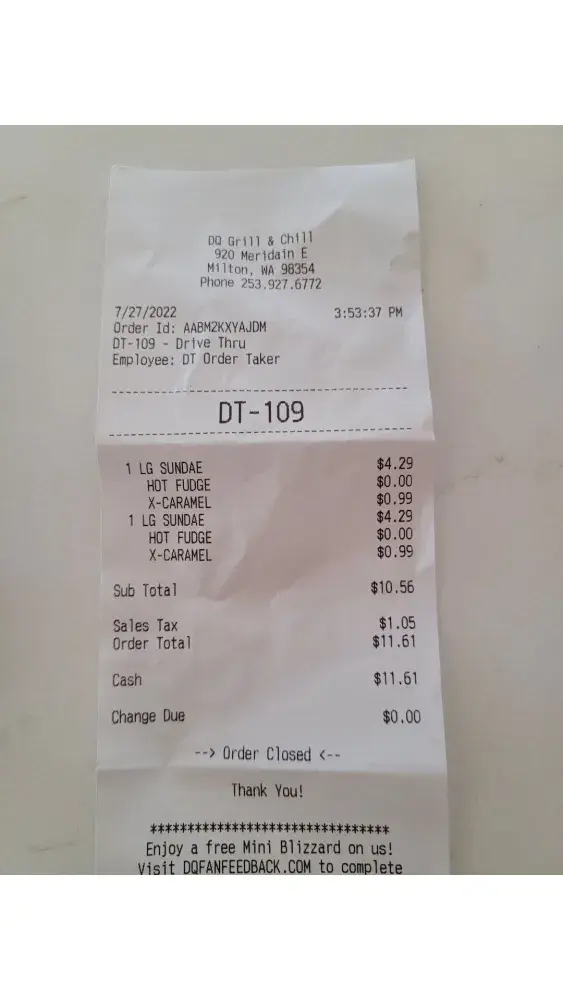 Hi, I was at my local DQ yesterday (8/12/22) I am a frequent flyer there as it is a favorite with both my children. OK. Lets start with a "side complaint" first they hand me my small shake, ok cool except they had me waiting so long my shake is practically liquid which I didn't notice until I got home (less than 3 minutes away) Why it took so long I cannot fathom as my rings nor fries were especially fresh. So back to the window, I finally get my food and peak inside to make sure it is all there and notice my onion rings I ordered large that day to satisfy multiple people are seemingly lighter and upon shaking not even filling the whole container. So I look in and wave at the drive through kid to let him know it looks "small" he gives me a half grin and says "Oh, I'm sorry. Have a nice day" not even going to acknowledge the fact that it was shorted. As a regular customer I would never start trouble or try to get freebies. So slightly fuming but not pressing it I head home. I get home and weigh the container on my kitchen scales. It weighed 97 grams, according to the carb counting website a Regular onion ring should weigh 113 grams, and I ordered a large. So as the mom I decided not to have any and split them between my kids. Going back and complaining immediately despite my proximity to the restaurant was out of the question. I have a hungry family to feed and I was not going to disrupt their day with being grumpy about it, they are young an innocent and simply hungry when I come home with food. No establishment run by mostly teenagers is without the occasional error, we mostly just deal and return as I understand we are all human. They often give me small tenders, we deal. Soggy fries, ok the toddler doesn't mind. forgotten ranch for my son, alright we have some in the fridge although not the same. I don't complain much, but the snarky "as if" attitude of the employee when I mention it immediately before I even drive off and having to forgo my own portion were top popped when I put my milkshake on the counter and it looks like sloppy milk. I am supremely disappointed and will likely not be returning for some time unless it is made right. I did not receive a receipt either so I am including the email & phone number linked to my account that should verify I was there yesterday, as they are different than the ones I respond to and entered in the form. I also have screenshots of my food, and bank transaction of my total 18.37 after using an app coupon for my small shake. I can send the screen shots I took of the food weight and bank transaction if needed as well. My account email is rina.[protected]@gmail.com phone number [protected]
