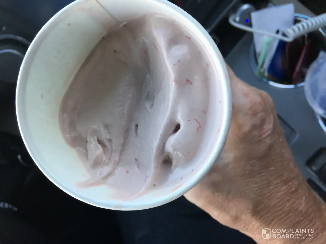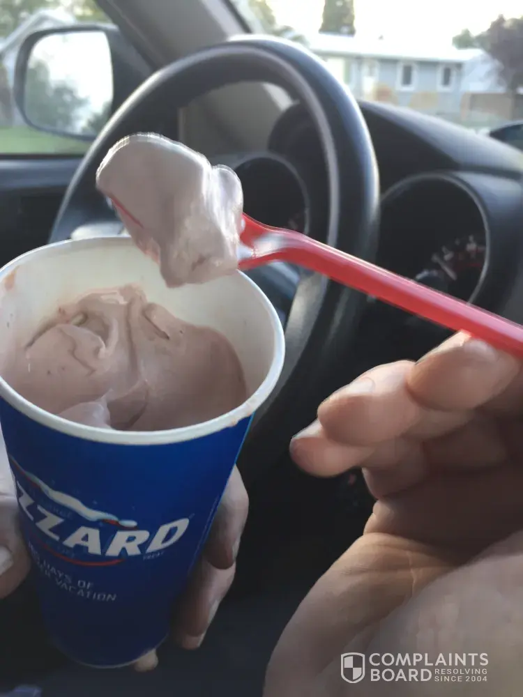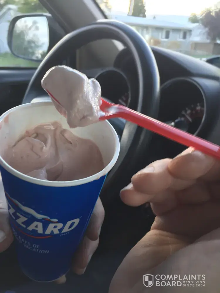 Every time I get a blizzard it sucks so bad I won't take my wife back for at least two or three months. I have a picture of the last one I bought about 30 minutes ago I'll send if you tell me where. Do the employees not realize if I spend 5 or 6 dollars on a blizzard I would like the ice cream to at least be colored. I ordered strawberry and chocolate just like the one Dairy Queen advertised last year but for some reason that is way too hard to figure out. This Miles City MT. Dairy Queen always well maybe not always 7 out of 10 at least. I have been to other Dairy Queen's and Braun's ice cream so I know what a good treat should taste like. All I ask is can you fix this store. It has sucked for as I can remember. If it was called Slick's ice cream shop then I would expect no management. So my blizzard was a little pink colored never seen any strawberries just pink no chocolate not even a little on the inside of the cup. I have a hot double cheeseburger hot onions rings by the time I get done going around the drive through again everything's gonna be cold. If I start [censored]ing at the window everything's cold ya so what do you do.