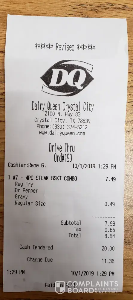 I attached my receipt for you to view. This Dairy Queen is the only one in town, yet only has one cook in the back and is mostly busy. Today I went at 1:29pm (few customers were there), I ordered in the drive thru speaker, paid at the driveup window and was asked to park in the front. I asked the clerk not to forget about me because the last time I was made to wait in the front, I had to get off and get the food after waiting so long. Well, it happened again. I sat there in my car waiting for my food that never came. I waited unti 1:45 pm. and decided to get off and go into the restaurant. When I approached the counter, my meal had not even been close to being made. I still had to wait there at the counter while it was being made.