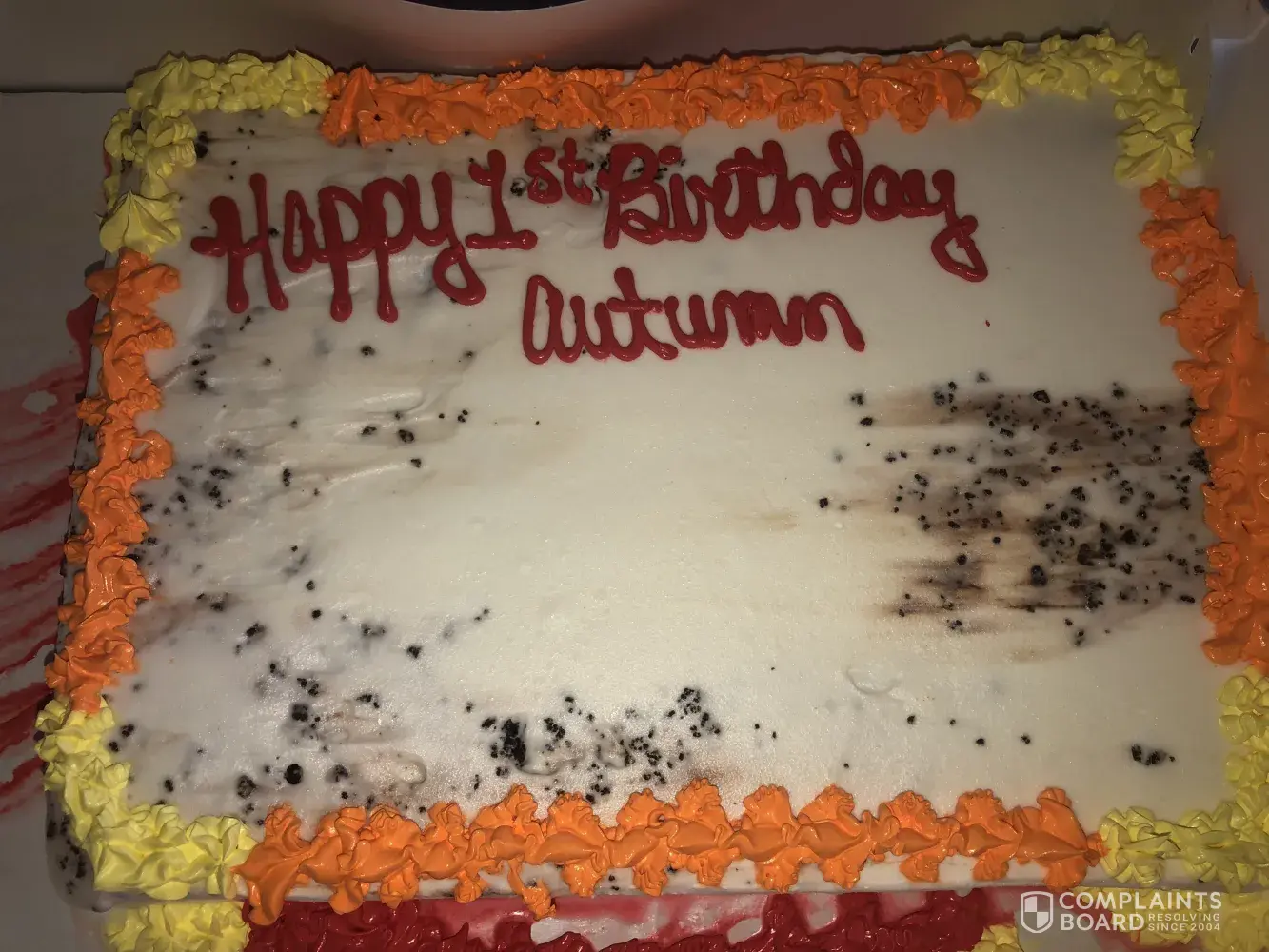 I had ordered a cake from DQ in Spencer, WV. And was very annoyed at this cake. I simply asked to write Happy 1st Birthday Autumn with Minnie Mouse in the middle. They had told us that their projector wasn't working at the time, which was fine because they said they'd free hand it. When picking up the cake, we were rudely told that nobody could draw Minnie Mouse on the cake, and the cake looked terrible part of the cookie was still showing from where they didn't put enough icing on it, the cake just looked terrible over all! I feel that if something should be done about this! I'll never recommend anyone to this Dairy Queen again. Very very disappointed!