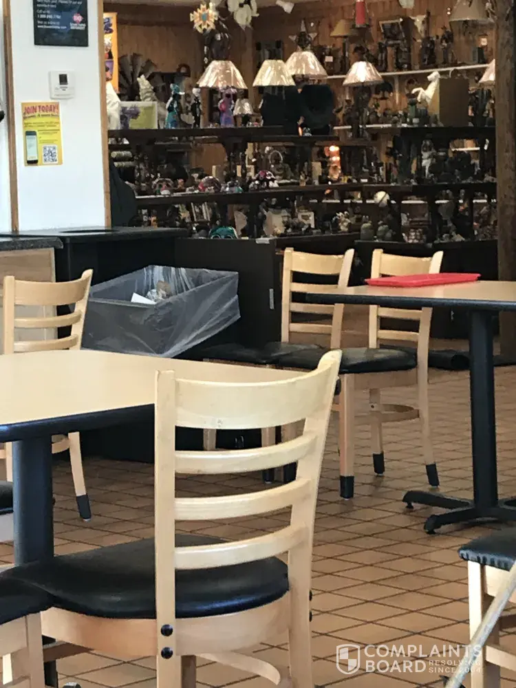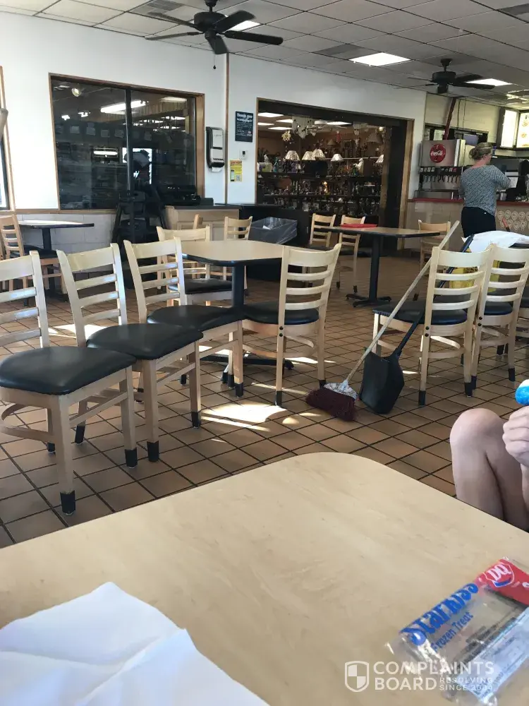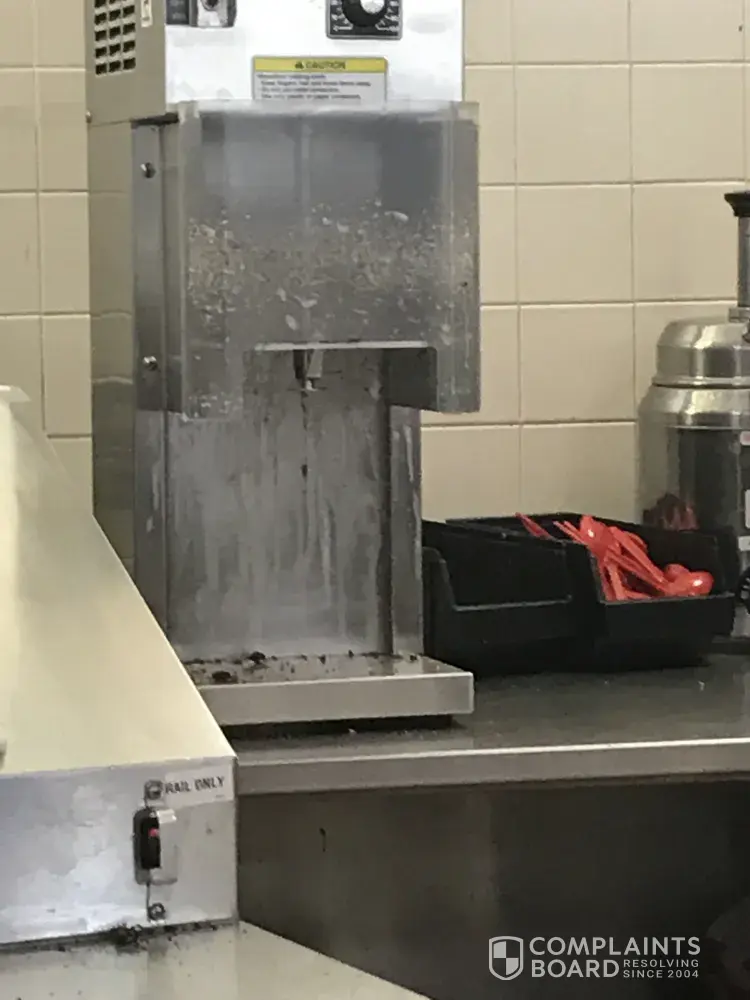 Trash can was open, mop and bucket out in seating area, equipment was filthy.