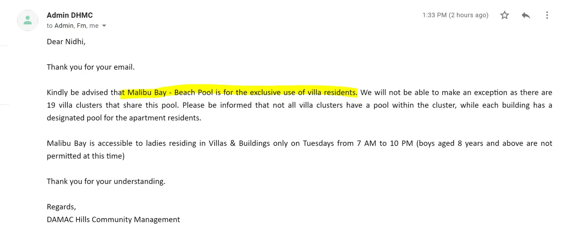 We were shown the common amenities around the community and shown convincing videos and photos of all common areas and amenities including the Malibu Bay Area. We were sold the property stating that all these areas are accessible to all residents of the Damac community.