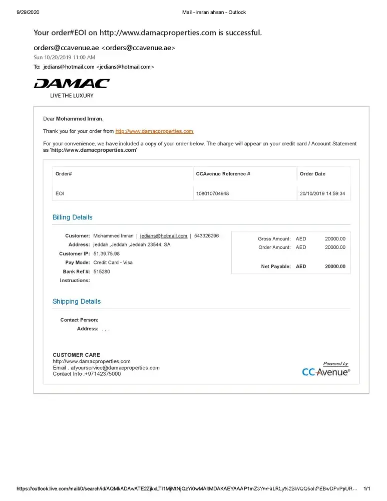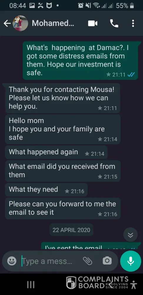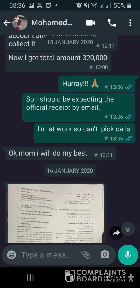 When I came out of the hospital, I wrote to Damac that I wanted to cancel the contract as it was wrongly sold to me. I explained all that happened sent my hospital reports to confirm my health issues and that I lost my job in June, my sisters are refusing to sell the inherited property and I do not know what to do. I did not get any reply for a while. I was told the mail will be sent to their management team and a reply sent to me. Mohamed called me and begged me not to put in him trouble, that he is willing to refund my 6,000 Dirham. That was when I realised that the 6,000 Dirham he took off my money was not official money. He tricked me to take that money off me. Despite me informing them by email of my situation, no one in their managerial team has called or contacted me. I only received emails and called from a salesperson.