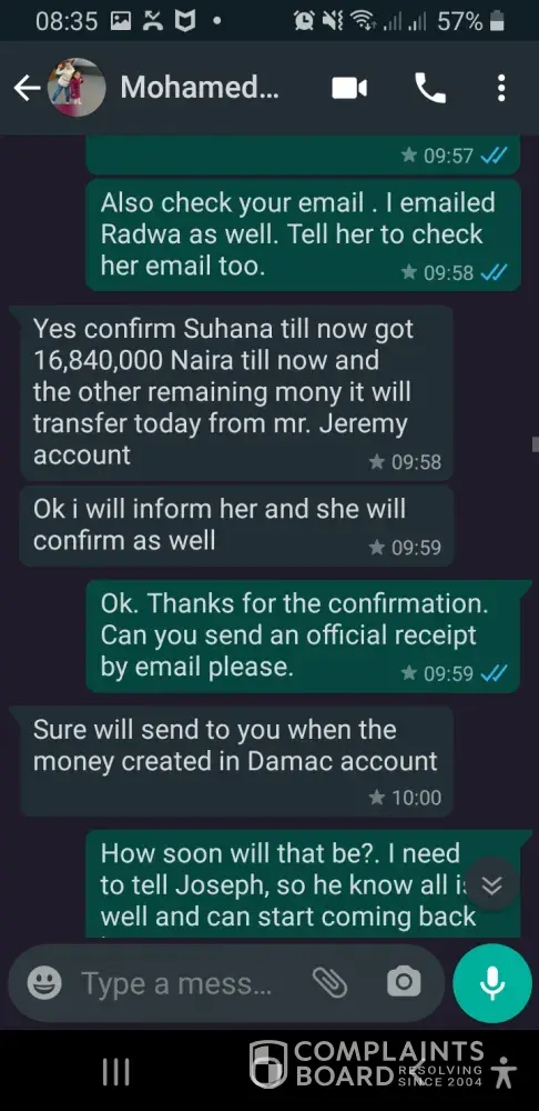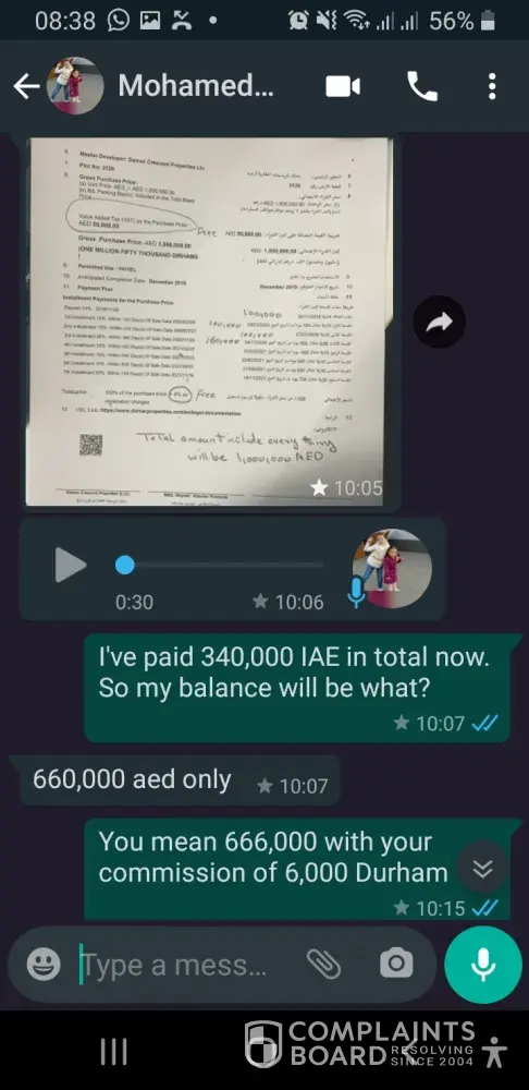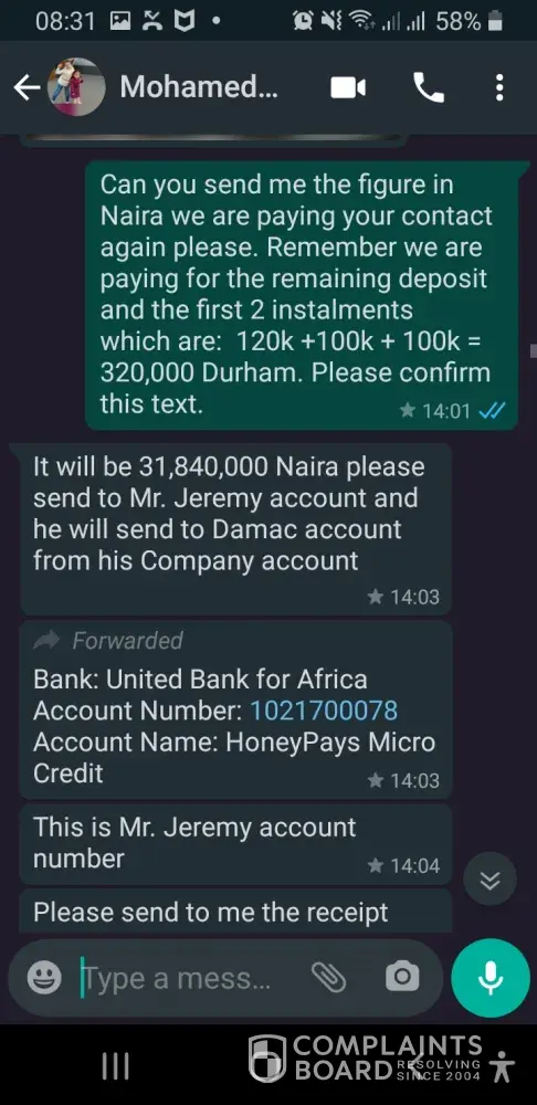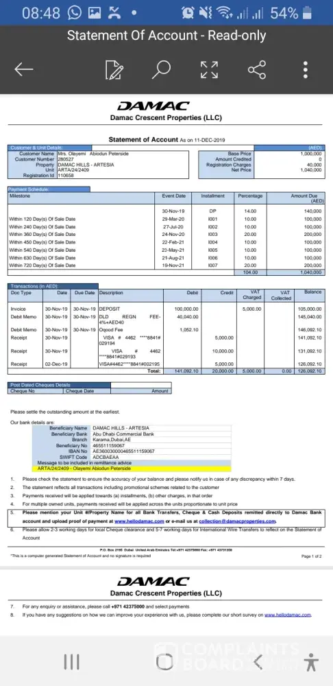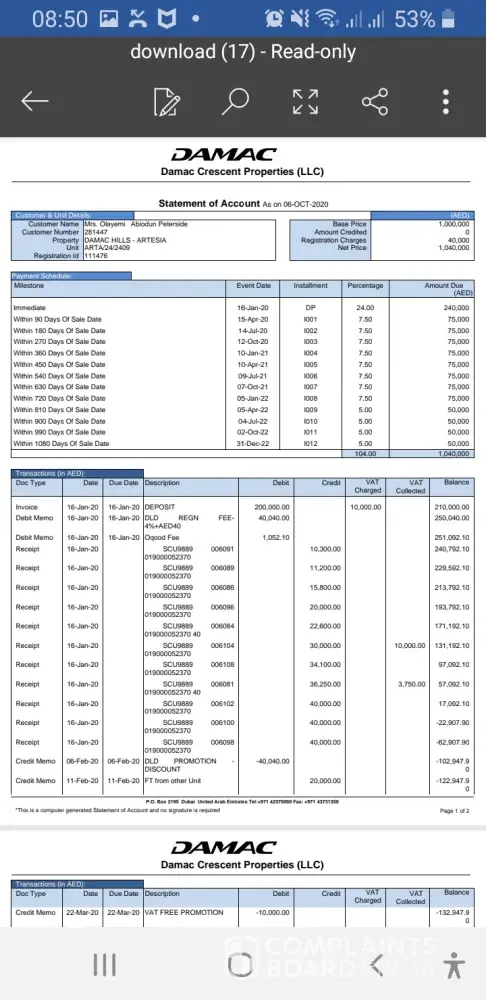 Good Morning. I did an investment with Damac, in November 2019, when I came to Dubai for my 25th wedding anniversary (That was my first time in Dubai). which was froth with a lot of irregularities. We met a salesman for Damac, Mohamed Moussa at the shopping mall and he persuaded my husband and me to take a ride to their office. Our assumption was just to see what they had to offer. I was made to sign a contract when I was taken to their office. I was there for over 8 hours and was not allowed to go out expect to take a pee. I told them that I did not have the funds to pay for this investment until I sell an inherited property in Nigeria. The salesperson said it is ok and that I have nothing to worry about. I also asked that if I am unable to complete the purchase, what happens to my money, I was told that any money I have paid can be converted to buy another property within the Damac portfolio. The salesman, Mohamed and the Manager, Radwa said they did the same for a client, a Mr Jeremy. They phoned the man and asked him to confirm if they did help him to convert to another property, and he answered affirmatively. They collected 15,000 Dirham as deposit form us. The next day, they came to pick me and my husband up from our hotel, we were held there again for several hours and another 5,000 Dirham taken off us for this contract. Making a total of 20,000 Dirham. We travelled back to London. In January, I cleared my life savings of equivalent to 340,000 Dirham with the salesman, Mohamed, introducing me to a company in Nigeria that had a business and an account in Dubai to pay to and the cash od 340,000 Dirham was to be transferred to Damac. A day after he collected the money, he called me and said the discount of 5% promotion and 4% discount for Dubai land registration will not be given to me, if I did not pay him his agent fee of 6,000 Dirham. (The discount will be a total of 40,000 Dirham). I queried that and he said that is the way Damac operated. That if Damac would have to pay him his commission, they will not give me the discounts. So he took 6,000 Dirham off the 340,000 Dirham and paid in 334,000 Dirham. I have already sent an email to Damac and the sales Manager, Radwa, asking them that they should acknowledge the 340,000 Dirham I sent. He told me to resent another email and say I sent in total 334,000 Dirham and he will make sure the discount is applied to my investment, which I did. He then forwarded the discount paper and hand wrote on the discount in the PDF he sent to me. This was now 340,000 Dirham I had paid. The payment of 340,000 Dirham was supposed to cover payments till November 2020, to allow me time to sell of the inheritance property. As soon as Damac got the money, I received another payment invoice different from the one I got at the signing of the contract, detailing that I will need to start repaying in June 2020. I panicked and called Mohamed. He said I should not worry that I already have payments made. In March, I received an email and a phone call chasing for instalment. Mohamed intervened and said it was a small issue in logistics between the accounts department and sales department. In April, I got another chase stating they have not seen my payment. I called the sales manager, Radwa, and requested if I could cancel as I was already getting jittery about the whole transaction. I only get chases for instalments and no one responds to my emails. In June I got another chase, and on the e#1st of July, I got an email that my account was been cancelled due to lack of payment, which was untrue. Then I started getting calls chasing for payment. I called the sales Manger, she did not reply back, Mohamed was away to Egypt. A month after in August, on the day they said I needed to pay an outstanding of 24,000 Dirham, I have a heart attack and was hospitalised. A month after that, I had a suspected mild stroke and the pressure was too much and my entire life savings was struck in Damac.