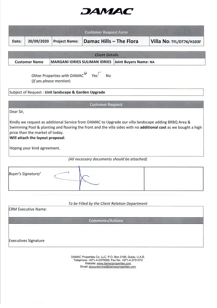 - At this point Mr. Omar appeared as he was the direct manager for Shaima and he apologize on behalf of Shaima's fault so I asked them about the compensation that you'll provide for the final client to settle this fault. So we request the following [BRBQ area, Swimming pool, planting and flooring on the front and both sides of the villa] so he made the design and handed to us and asked us to mail it to the address [protected]@damacproperties.com Cc: shaimaa.[protected]@damacgroup.com and he'll take from there with DAMAC management. And we sent the email dated: 20/Sep/2020 with the subject Request for additional service - DAMAC Hills - The Flora - Villa No: TFL/DT76/H103F without any replies from anyone and every time I asked them, they were telling to just wait for their response. [attached is the drawing provided by Mr. Omar].