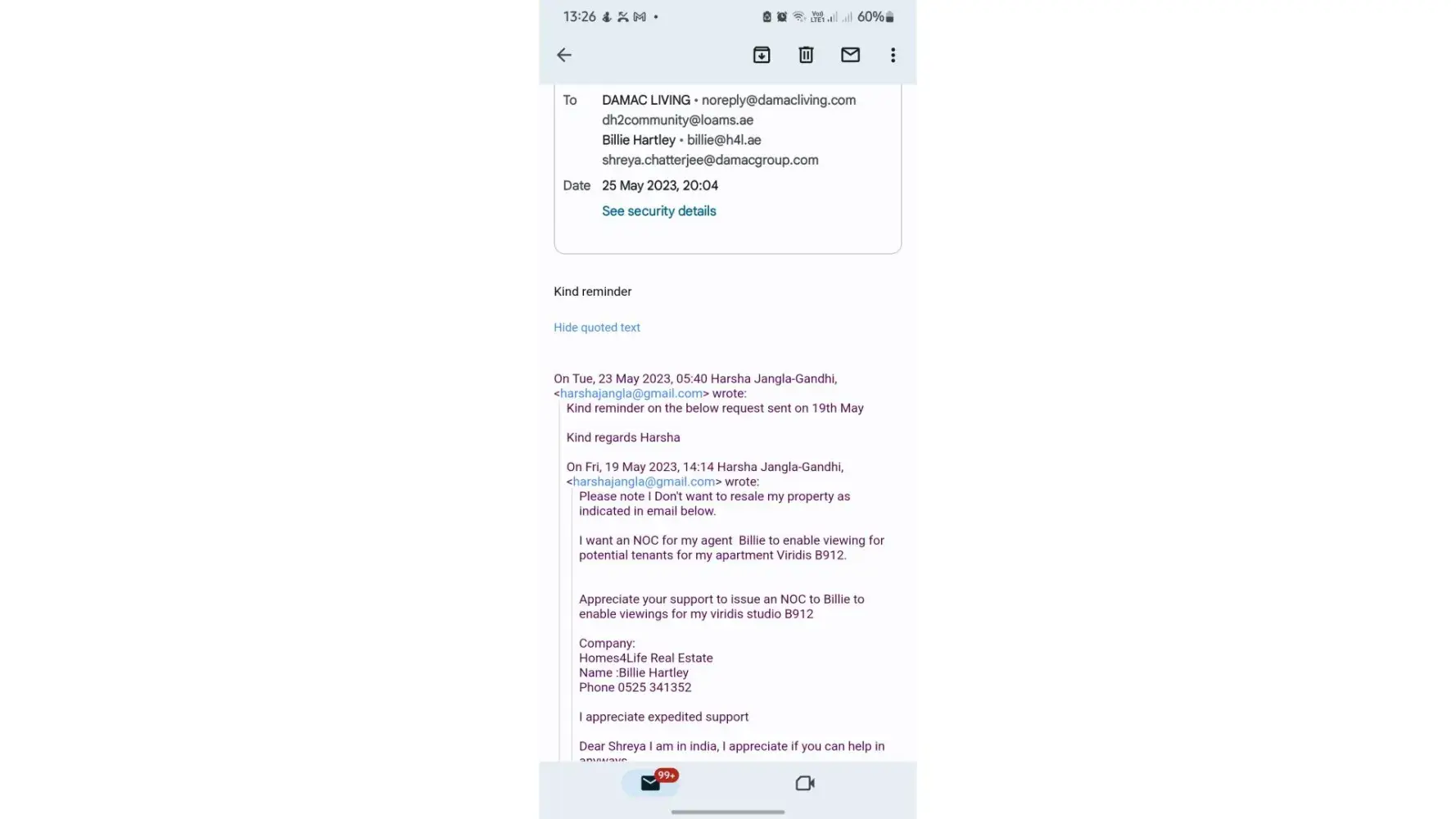 I have emailed [protected]@loams2.ae since 19th May and havent received any response to my request. My request is that I need an NOC to allow agent to conduct viewing on my behalf to Potential tenants for my newly bought apartment in Viridis B912