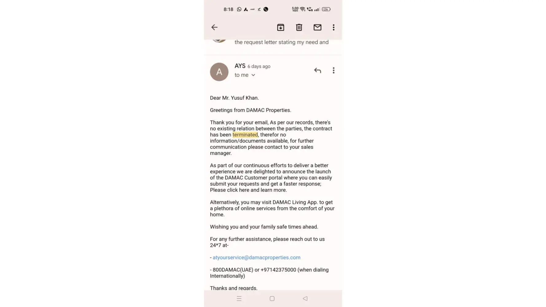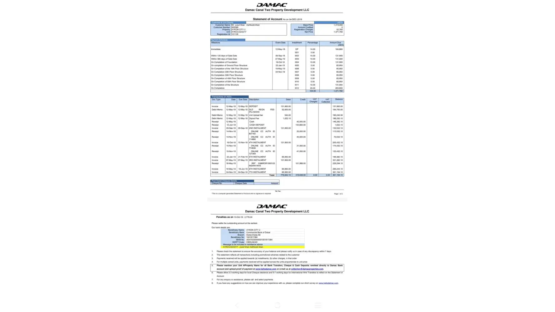 I bought a property In Damac which is a company in Dubai in the year 2017. I am not a resident of UAE. I am a resident of India. I have been paying the amount accordingly. But then we had to face Pandemic lockdown all over the globe and so I was having a financial crisis at the time and thus I requested Damac by emails saying that I won't be able to pay the amount anymore atleast for the time being, I also asked them to either change the payment ratio or give us a better solution which might help us but they didn't listen to me and keep pressurising me into paying the amount or they might terminate the unit. They eventually terminated my unit without my knowledge even though I had paid them 28% of the actual amount which is 418,000 AED ($113,803). They mailed me about the termination and asked to me forward any queries to Dubai Land Department (aka DLD) from now onwards. I had to visit Dubai by taking a loan and then the officer there listened to my problem and then called and shouted the Damac official. So the Damac official agreed to help me and promised to solve my problem within 2 days. I went to Damac office with the official and there he told me to write a request letter stating my need. After writing the letter he asked me to wait for 2 weeks. Even after 2 weeks I didn't receive a response from them and on visiting they told me that they were busy and now they will look into the problem and asked me to not worry as it is a very huge amount and they won't take it and asked me to go India as it might take some time to process it. So, I returned to India and as I did, I receive an email from Damac stating that they have already sold my unit and there is no relation between us anymore and that they can't help me with anything. They also said that they sold my unit to someone for 1.7 Million. Not that they terminated my unit in September 2021 and said that they have no relation between us but when I went to Dubai in October 2022, they agreed to help me and acknowledged my issue. But they suddenly changed when I returned to India and mailed me in Jan 2023 stating that they can't help us with anything as they already sold my unit and they don't have any data regarding the same they used to changed their commitments often their this kind of behaviour actually show that they did it purposely to take the advantage of pandemic as they are running many projects and for that they need money.