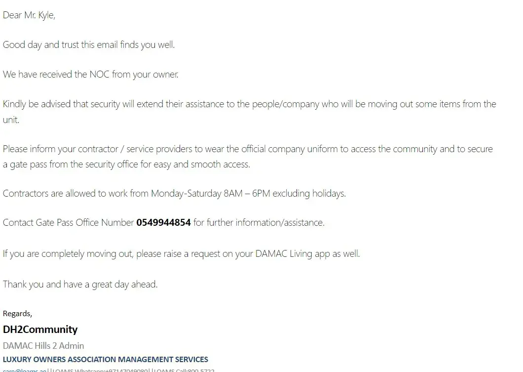 Gate pass office personnel aside from BEING RUDE, doesn't even bother to read the email that is being shown to them by the mover company that we rented and my brother (who came home from work just to check why the gate pass office is denying access to the mover company), we are well aware of the schedule and moving dates allowed by the community and made sure we followed that carefully, despite having the confirmation from LOAMS DH2 and NOC shared to security team as well and email from the registered email from the landlord we are still rejected by the gate pass office and ask us to visit DH2 office in community center, my brother went there and ask the admin and the admin called the security gate pass office and instructed my brother to show the email, the EXACT EMAIL my brother is showing to the guy on the first place which he doesn't even bother reading it and insisting to go to the DH2 office,