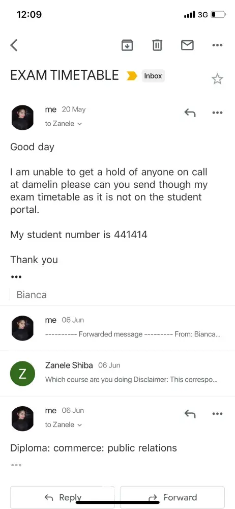 Paid my fees in full when I registered. The student advisor told me to use my ID number as a reference because she couldn't give me my student number until I paid for the course, that was in February. Damelin has been sending me notices that my fees are outstanding. I've emailed the receipts to about 5 different people for months now and they still haven't rectified my financial records. I have not received my exam timetable or assignment results and it's already 22 May 2019. Yes I submitted my exam application and paid for the exams. According to Damelin I was supposed to receive my exam timetable on 3 May 2019 and exams starts from around 4 June to 14 June. How will I be able to request for study leave for my exam without proper notice? And when do I start preparing for exams without feedback for the assignments and without my exam timetable?