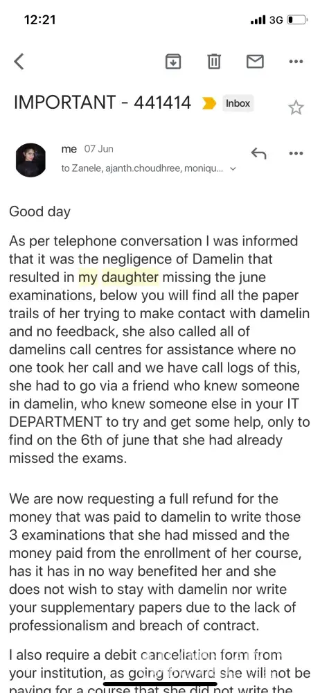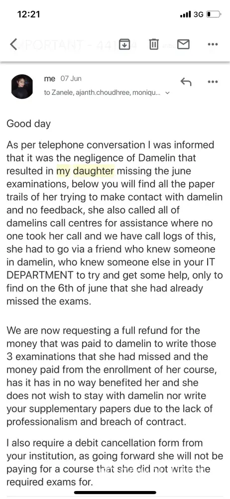 My name is Bianca, I am a student registered at damelin correspondence, student number 441414. I registered end of march and thereafter told to pay for the june exams which was R450 per module which I had paid (R1350). Through the duration of these months I sent emails requesting my exam timetable, to which no one had replied to my emails. In the middle of June a friend of mine knew someone in damelin who knew a person in the IT Department, he then requested my student number and sent me a timetable to my amazement I had already missed all three exams I had paid for and still no one had replied to my emails or took my calls. It is now the 25th of June and I request a full refund of the fees I have paid including my registration fee of R3000, monthly debits and exam fees, has damelin has in no way helped me or aided my studies. I now need my money to apply to another educational institution only to find an email this morning that they will still debit me until they resolve the matter, which I have brought to their attention 2 weeks ago, and they state that they have the right to retain all the money I have paid to them