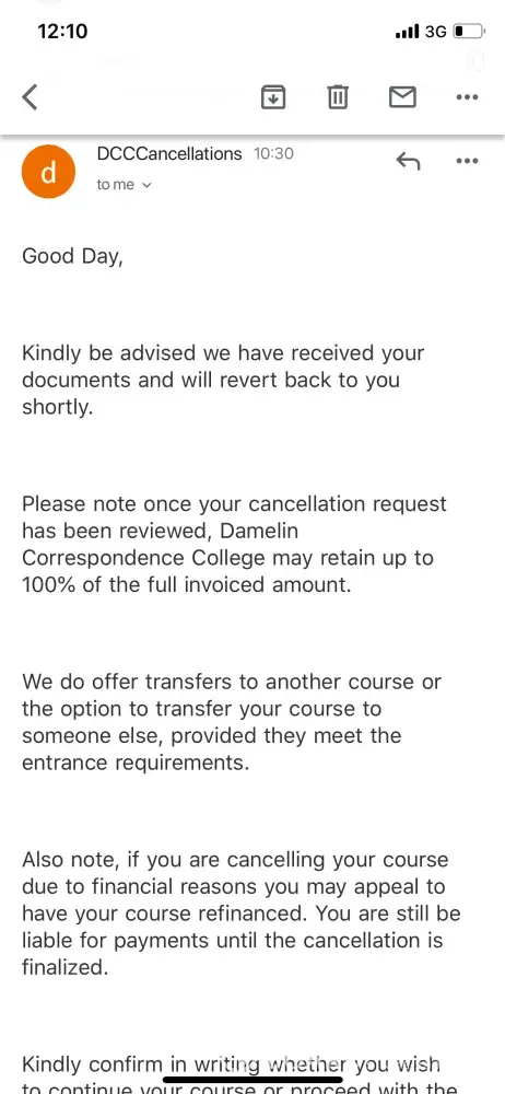 In September 2018 I requested to cancel my studies - someone only deemed me worthy of a response in January 2019. Then eventually after many HOURS holding the cancellation is processed and now the refund is due... Again its taking forever! Refund was approved 21 January 2019 - it is now 02 July 2019, no refund paid! According to Damelin Policy "Timescale for refund Damelin Online will process the refund due to you as soon as possible and within 90 calendar days of the day on which you requested it. " - According to their policy it should've been paid on 31 May 2019 - We are on day 111! After a 1 hour and 10 min hold on their line, someone finally picks up the phone only to place me on hold again! They are ABSOLUTELY USELESS!