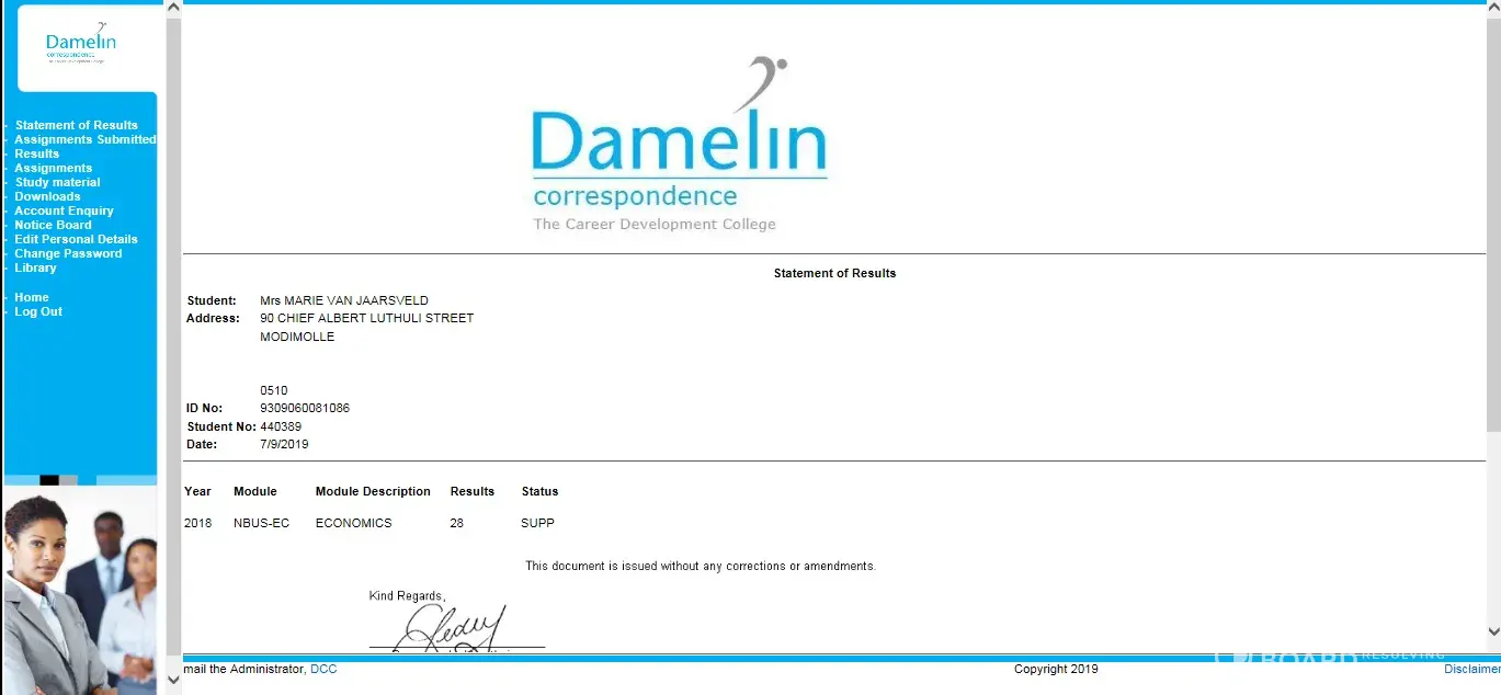 I am having a really bad experience with Damelin Correspondence College. When I wanted to register there was no problem with getting assistance until payment was made. thereafter nothing. I have not yet received my assignment results and they where to be out on the 6 of May. for all 3 exams there were not enough exam papers for all the students. For the next semester I wanted to purchase my book- guess what? the book is out of print. I emailed Damelin and still no new ISBN number. the only answer I get is - we have forwarded your query to whatever department for urgent assistance and still no answer! Today I went to my student portal and find out that I received in my 2018 academic year 28 points for economics. Aren't we in 2019? How do I know that these are my results? Emailing - Calling - chat site - student portal - nothing works! for the amount that I paid for this course the service should be excellent! Any suggestions?