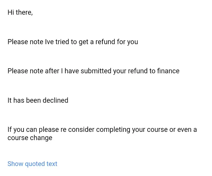 Disgusted pissed,with the level of service from the school.Your employees are useless.How do I pay for am course am not studying for,I asked for my course to be cancelled and yet nothing hsaas been done.I did escalated my query to Queen and her manager Freedom which honestly cares about nothing but making sales.Am a full time employee and requested to study virtually or possible alternatives to be offered however that was never done.i immediately asked for this course to be cancelled and to date am fighting that battle.i hate the school with everything in me amd regret ever approaching them.