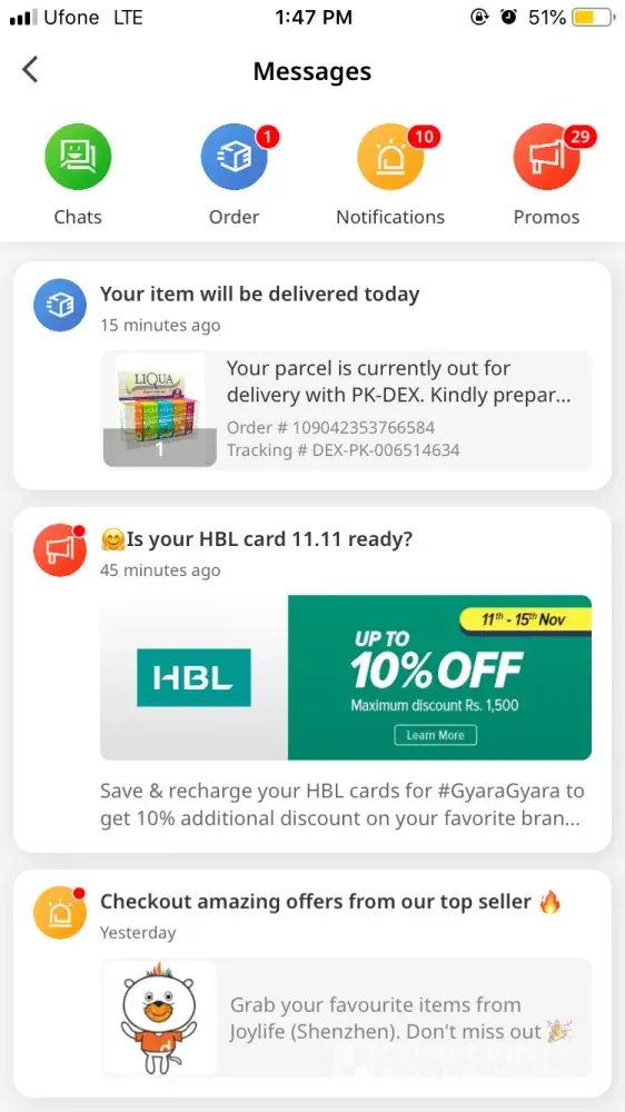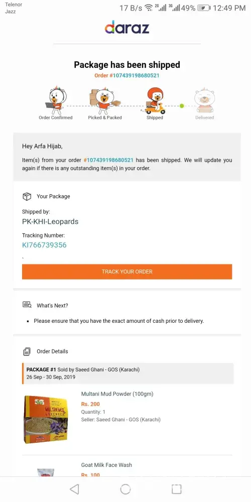 'Refused due to order cancellation' then 'Pending in Faisalabad' and after that it was updated as 'Not received by the Consignee'. Then the shipment was dispatched for Lahore and returned to the shipper. Now it is marked as delivery failed. I used a voucher to buy those thing. Daraz should return that voucher or send me my order again.