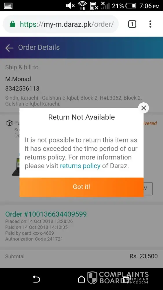 I've ordered a product from Daraz.pk on 5th October 2018, and i have paid through card and the order was processed and confirmed. The timeline was from 6th to 11th October but today is 29 and it's still not received. It's status was changed to Shipped on 13th October and they told me that you will soon received it. But it didn't came. I have complained 6 times but they are not helping me they just said that your complain is updated and we are working on it. Nothing else. The tracking code is still not working on leopard website. I can't cancel it because they told me that you can't because it's already shipped now. So they told me to wait. I am waiting since 11th October. It's been 24 days and they are not helping me out. Please check it out.