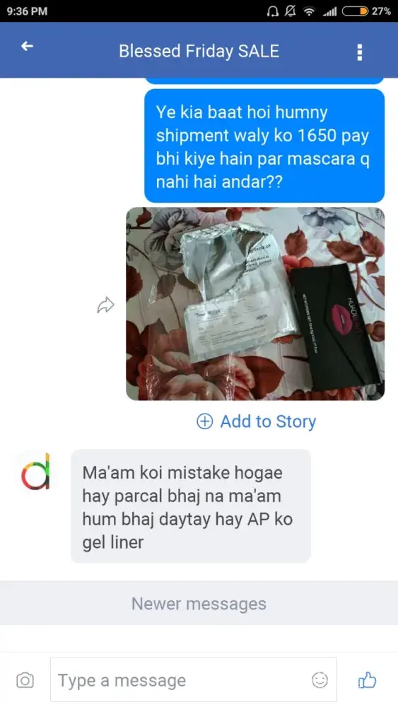 I have ordered 1matte pack and 1 gel mascara from daraz Friday sale from Facebook from this id [protected]@yahoo.com I pay for both on delivery of parcel bcz names of both items were written on bill on envelope of parcel... But when I opened it mascara was not inside I talk to that daraz emplyer from whom I have ordered from Facebook he said that they will deliver it but they have not delivered it yet plz let me know about this