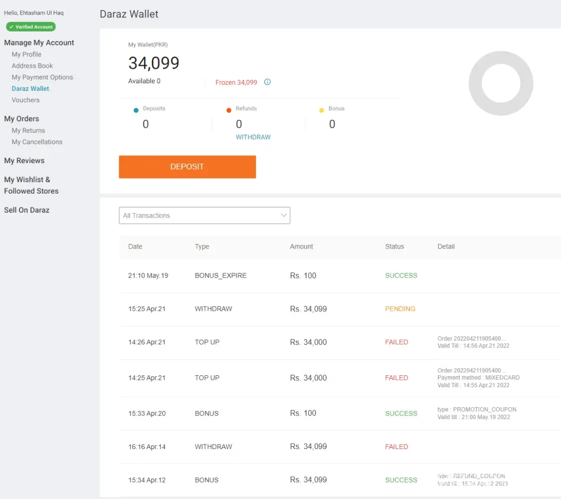 I received payment from the seller into my wallet on Apr 12, 2022 and processed it for withdrawal through bank. After 2 days, the request got failed. I tried again on April 21, 2022 for withdrawal but the amount got frozen and still is in pending situation. I have contacted several times with Daraz Customer Care and received each time a new deadline date. It took more than a month and the issue is still not resolved.