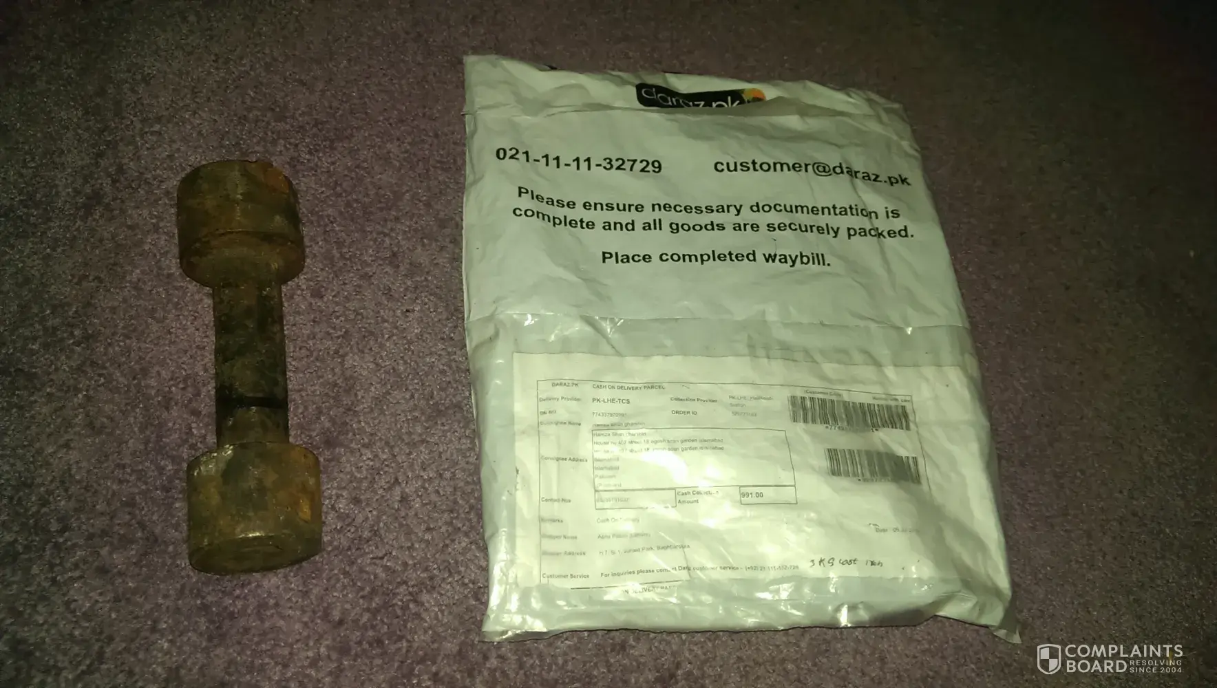 Ok so I ordered a pair of 3kg dumbbells a few day ago.I received them tomorrow and when I opened the package I found a single one kg dumbbell which was rusted and was filled with stains. I got furious and that why I wrote this complaint to get my money or the product I really ordered back.I also called their help line and asked them for an exchange but they wouldn't listen to me.so I am gonna tell u what is gonna happen.if u fix my problem I am gonna leave u be, but if u don't I am gonna spread this message on every social media website and I will make sure that no one ever uses daraz.pk to order some [censored] again and that's final.and believe me I ain't bluffin