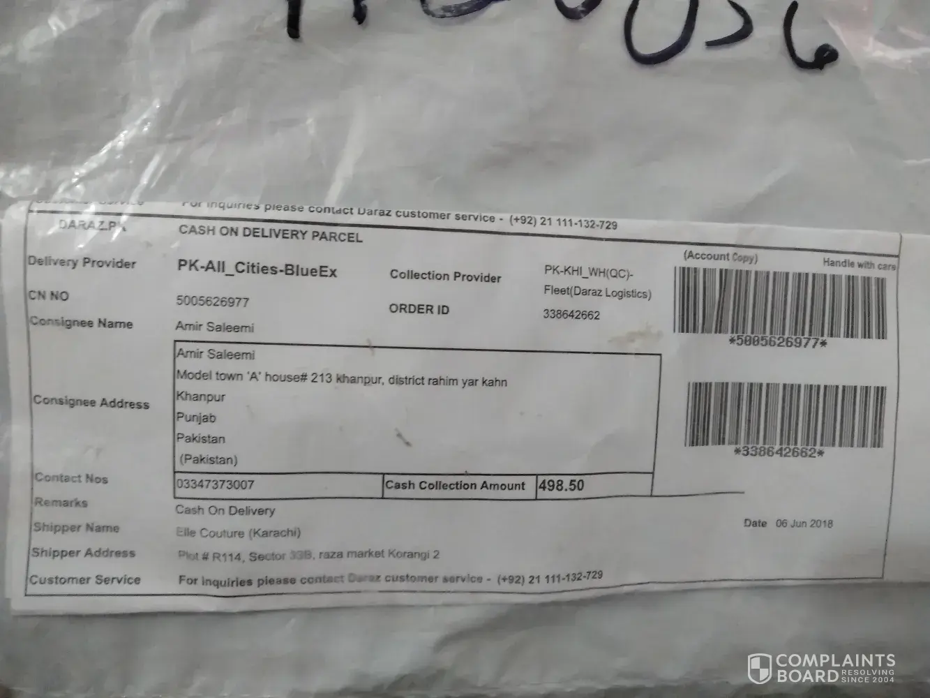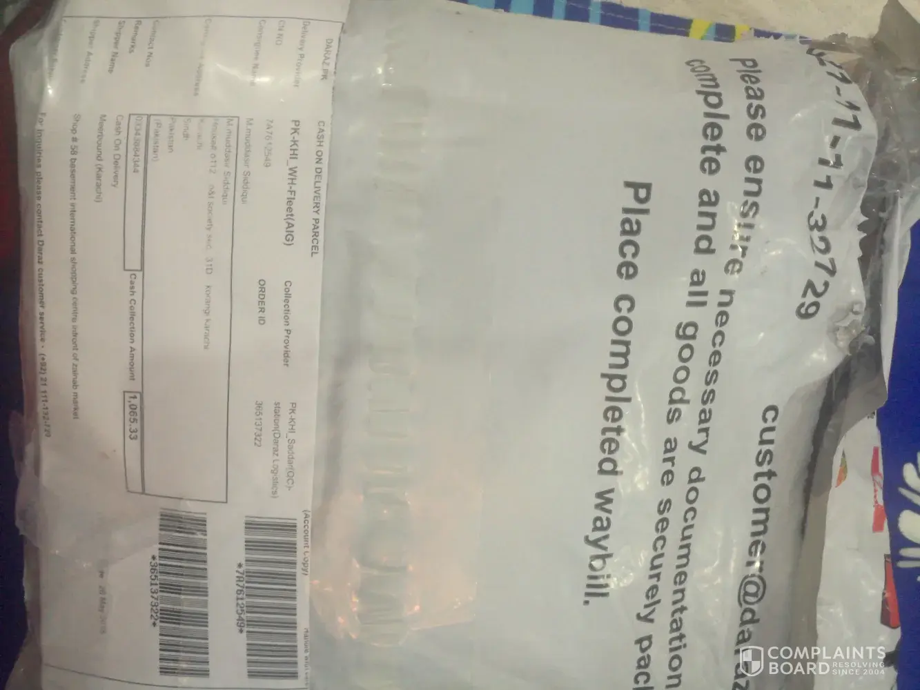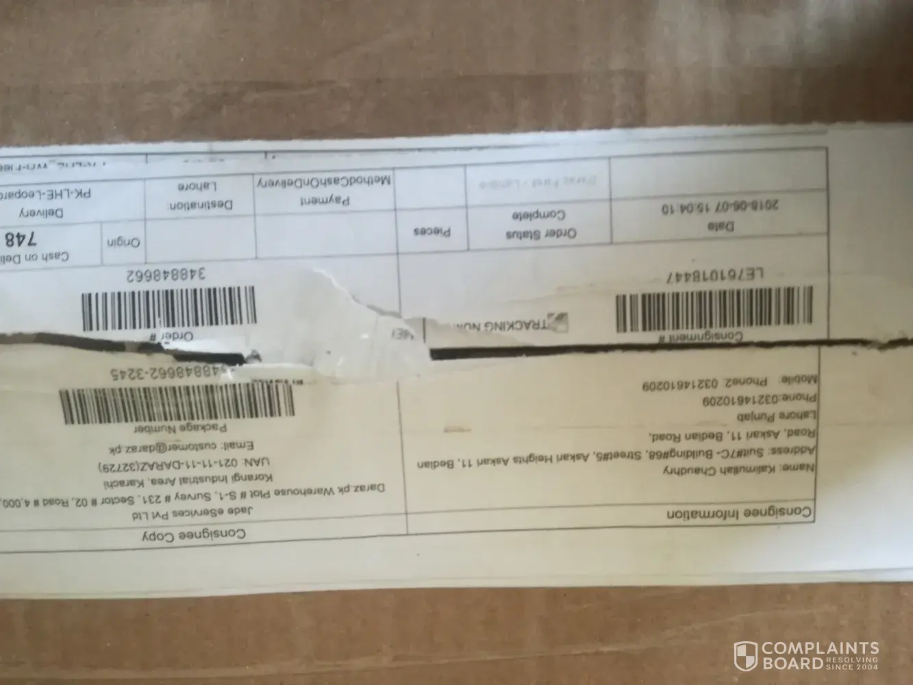 maine pack of 4 shirts mangwai thi jis ki price 200 thi with delivery charges 345 lakin parcel main se 1 shirt nikli or parcel main koi detail paper bhi nhi thy my order id 396165662 hai or shipper name : al fajar collection karachi hai or shipper address : house c-99 phase 2 gulshan e hadeed, karachi hai please solve my problem and reply me on my number [protected]