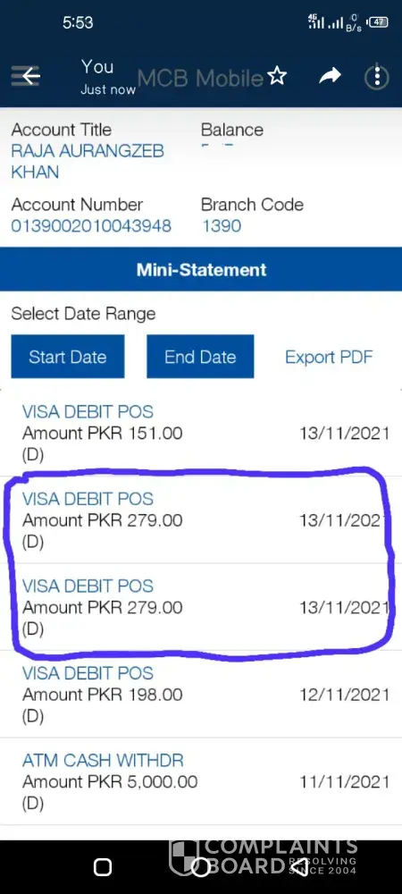 Keeping in view the foregoing, it is submitted to kindly probe into the matter by taking corrective action to save millions of MCB Account holders from such situation. My amount Rs. 279/- may kindly be recovered and credited back to my Bank Account (My bank account details are mentioned in back statement). All the screenshots are attached.