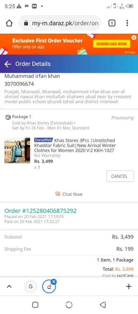 order [protected] was canceled .send thes order on this address tasleem uallah khan zari tarakiati bank mianwali.or return this my money [protected] jazz cash .2 days ago no response send by draz.pk