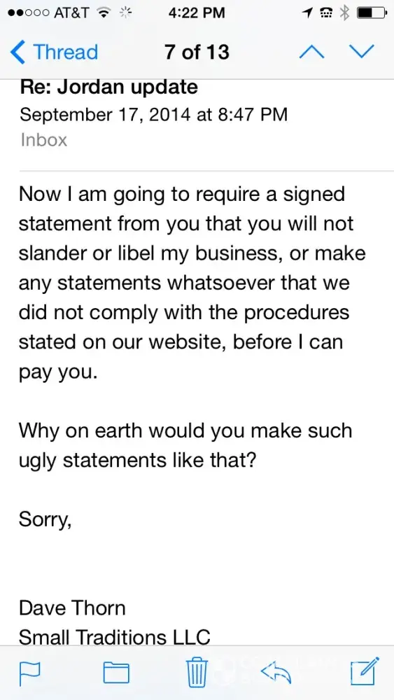 I than wrote these complaints on or about sept 18th or after and Dave wrote in an in email he refuses to pay me unless I do what he says... That's blackmail