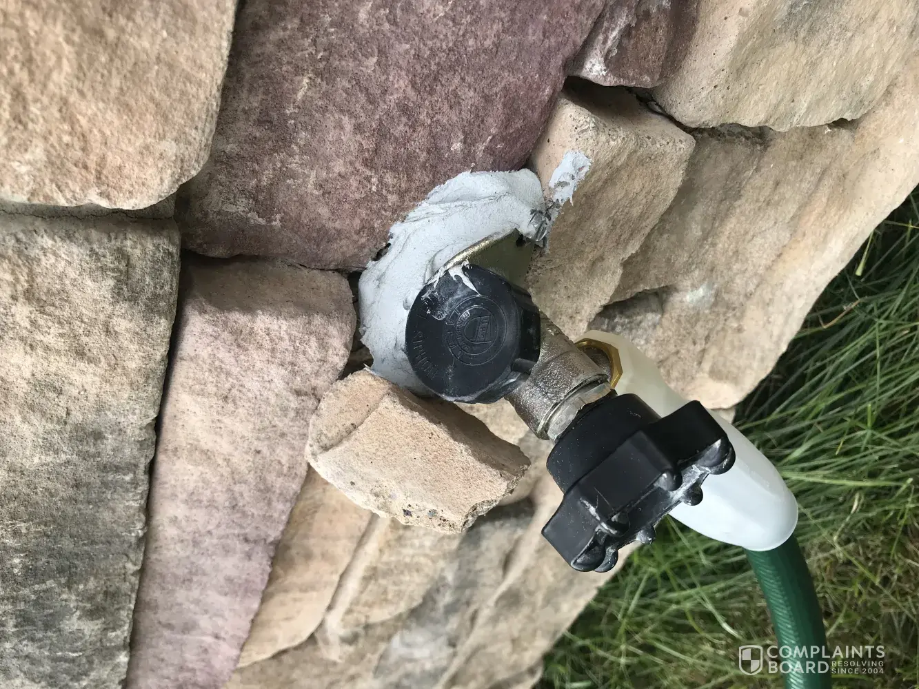 4) hose spouts leaking falling off the house and "repaired" with caulk that looks terrible and continues to be loose