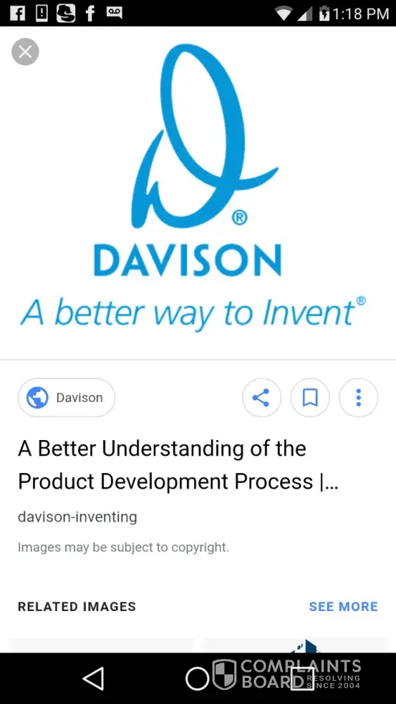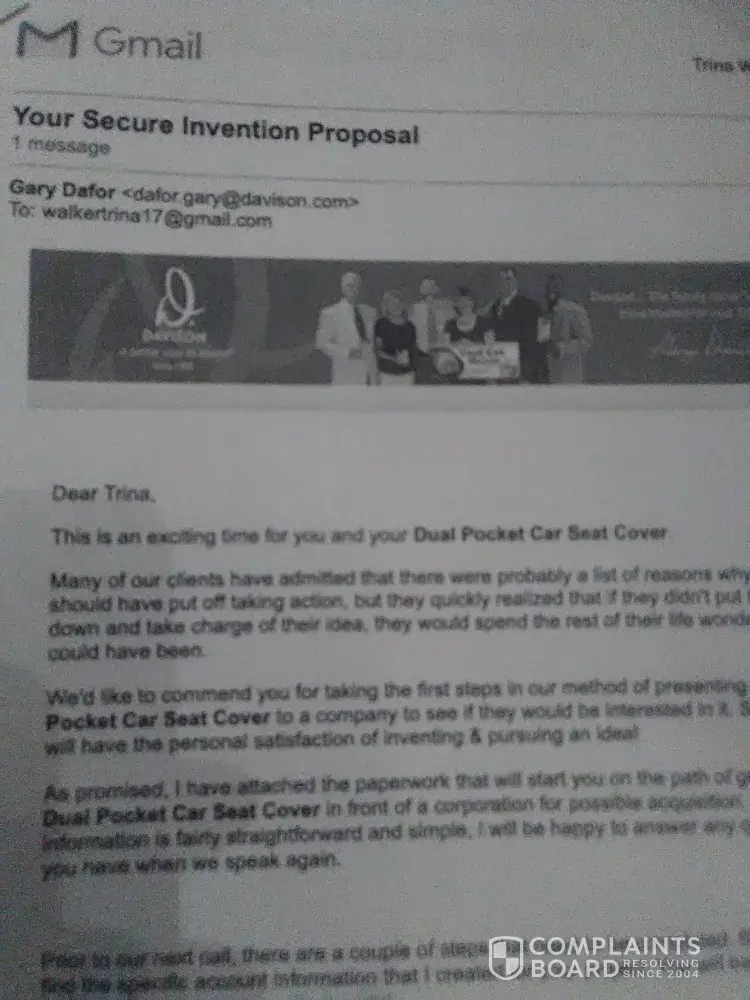 My name is Les Molina, and I have been scammed by Davison. They are very pushy people, they lie, they tell you what you want to hear, till they get your money.in my case, they told me that I had a very good Idea and that they wanted to work with me. They said that they have great contacts with big companies and that they would present my invention to the Clorox Company. I said to them why the Clorox Company, they deal with Chemicals, my invention is a tool for washing windows. I told them that I would rather approach a company like "Johnson and Johnson" because they own the Windex Brand. Johnson & Johnson and or Windex would be the route to go with for my invention and or to target as a prospect company to buy my invention, not the Clorox Corporation. Any how they keep saying that there was a problem with my idea, but they could never tell me what the problem was. We got as far as the rendering stag as they would put it. And when they sent me a rendering (picture) of my idea, I was literally sick to my stomach. I called my point of contact there at Davison, and I yelled at him, I said this doesn't even look like my idea, it couldn't even do what my idea was capable of. I told them to F — k Off and I never answered a phone call from them for a long time. They keep calling and calling leaving me messages after messages. After several years went by I got a call from someone at Davison saying that my point of contact was out on sick leave and he took over all of that persons clients and he wanted to continue working with me to get my product to market, but they needed to finish collecting money from me, they wanted a another $5, 000 dollars. I had already given them $7900 in the beginning and was not going to give them another penny. The new person that was calling me kept pushing and pushing me to finish what they started. But this person could not find the original contract that was drafted up and signed by my first contact. I still have that original contract I never signed it or even sent it back to them. I told them that we agreed on $7, 900 and that's what I sent them. I would like to be part of a Class Action Lawsuit against them. I don't know how to go about that. My email address is [protected]@hotmail.com and my cell is [protected]
