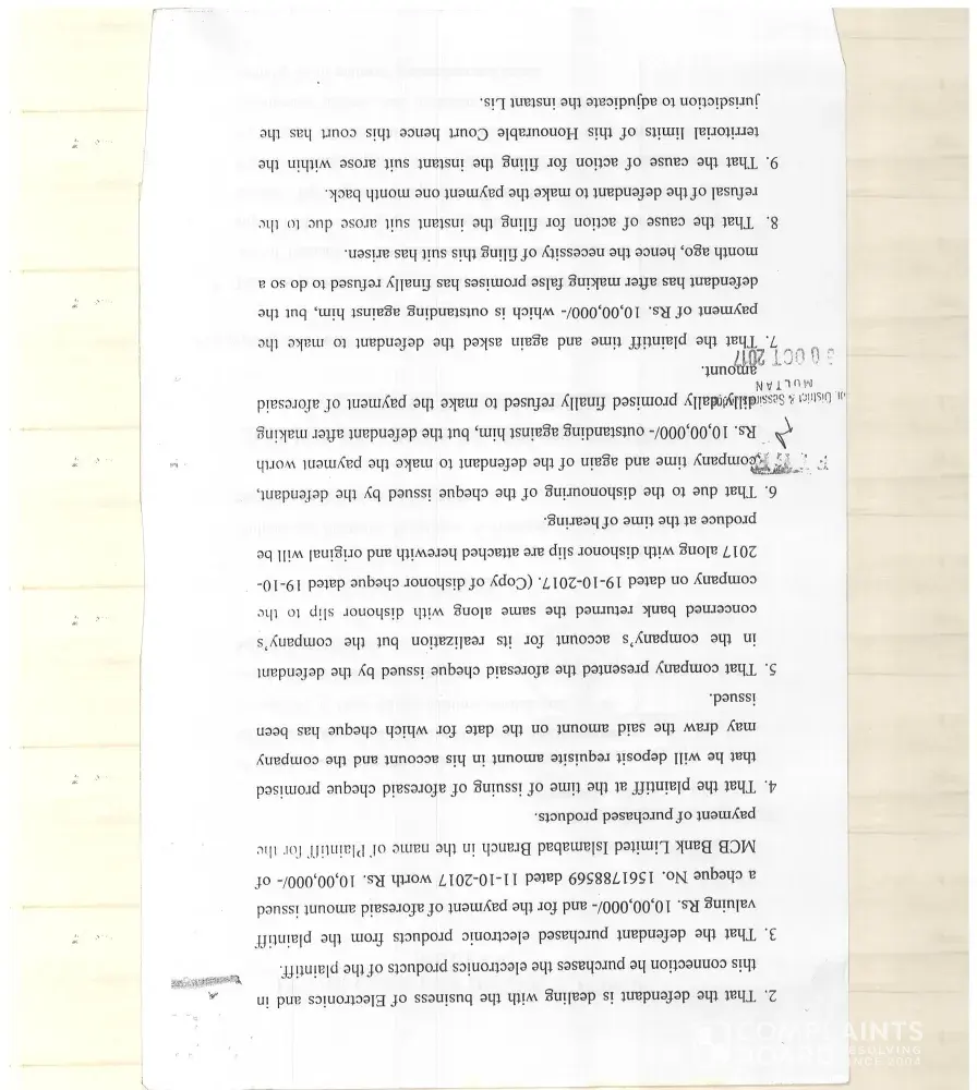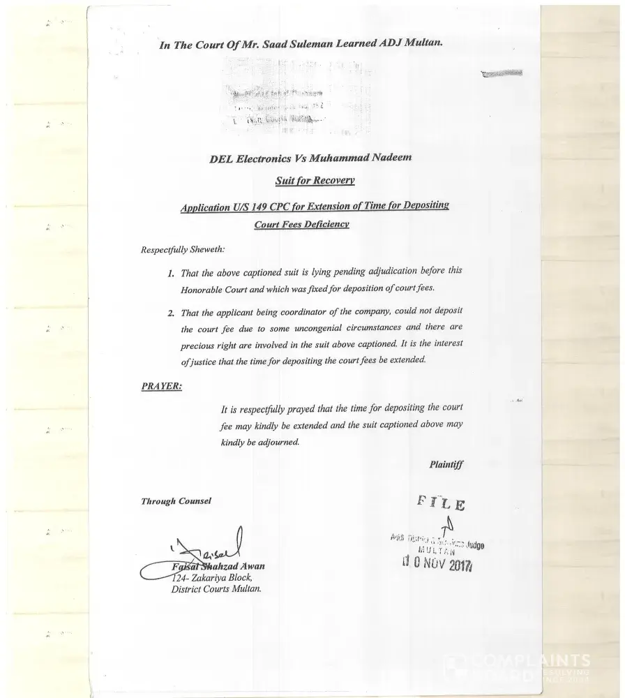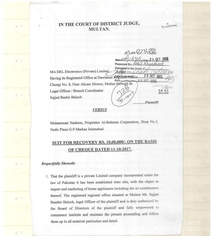 I am continuously asking either in discussions and also in writing to settle my issues with Dawlance but they never pay heed to them and are erecting walls against me by mal-practicing and wrong doings. A very interesting part of this whole episode is this, that Mr. Zaheer, Zonal Sales Manager, Rawalpindi, handing over my post dated cheques to Mr Arshad khan at Lahore Brach and Mr Sajid Baloch at Multan branche with mala-fide intention/ulterior motives without delivery of any goods, just to torcher me and my family and registrated a fake order 37 Suit in Lahare and Multan and then also registered a fake FIR at Lahore by Mr Arshad Khan and Multan by Mr Sajid Baloch, whereas I never been involved in business deals with Multan and Lahore branches of Dawlance. It is also very pertinent to mentioned here that goods of 800, 000/- from Lahore and 1000, 000/- from Multan was also included in my account, whereas I never dealt with the Lahore or Multan branch ever since, I started the business with Dawlance. That it pertinent to mention here that I has no direct relationship with the Dawlance Sales office Lahore / Multan, due to stoppage of invoicing / purchase of product two months ago, I stopped the payment of cheques in the favour of M/s Dawlance Rawalpindi despite the fact that the I contacted numerous authorities of M/s Dawlance Pvt Ltd including Mr. Salih Arsaln Tass C.E.O, Hassan jamil Country Sales Manger Pakistan, Mr. Talal Country Sales Head Karachi, Mr.Rouf Finance Head Head office Karachi, Mr. Asif Mushtaq Butt Regional Sales Manager, Major Ajmad Karachi.