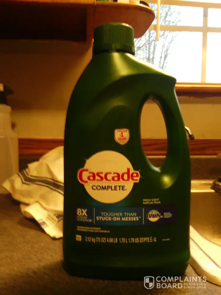The reason I am contacting you is the dishwasher detergent listed above leaves a powdery white dust on my dishes. I have used the Cascade Complete in my dishwasher for some time now. But the problem did not start until I switched from the orange lid Cascade Complete to the one I mentioned above-it has a green lid. Could you tell me whats wrong?