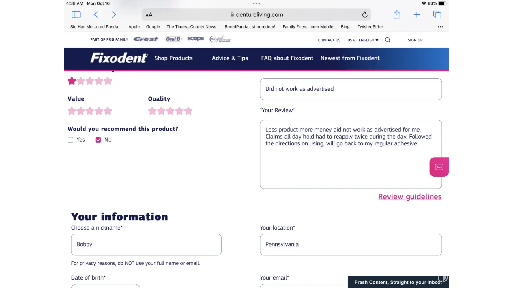 I am a denture wearer and I purchased your professional fixodent based on your claims. First off I had to reapply twice during the day, there is less product,cost more money and for me did not work as my regular adhesive. I tried to leave a review on your website and I could not submit it,all the fields were filled in.