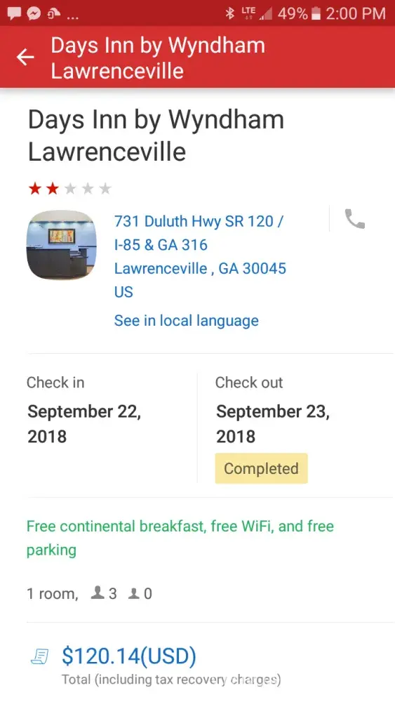 I booked a room at the days inn lawrenceville ga on duluth hwy 9/19/2018 thru hotels.Com. I booked this room fir my sister and her pet i stayed in a room with my fiancee we checked her in and i went in to get keys on 9/19/18 we decided she would stay there and pay nightly until we finished worming the fair in lawrenceville on the 23 rd i paid one other...