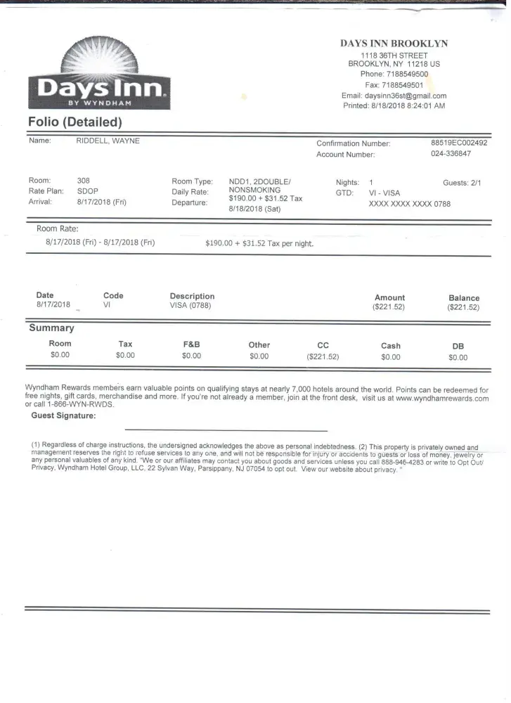 Thank you for your time and we have included just one picture of one of the real problems that you have demoralized us over this is so you know that we will not stand here and let you do these unbelievable and just awful things to good people that stay at your so called days inn, you give days inn and Wyndham a bad name and because of how you are dealing with this and calling us liars we also we be contacting city officials ex. health department etc as well as are attorney like we stated we have begun to contact other customers and individuals in regards to this unreal unbelievable and truly sad hotel.( we had done some research and back ground work and had come to find we are not the only customers you have disrespected, degraded, mistreated, charged with out authorization and now even trying de credit us and the problems with your hotel, we also would like to mention we are aware of many other customers that have had issues and problems with you on top of your bed bug problem that has been documented and recorded on many websites, we have started contacting all the negative comments as well as complaining customers and we all will be holding you accountable for this totally unbelievable e mail, lies and just don't right lack of respect and care for your guest, this is truly one of the most lowest class and unbelievable experiences we have ever experienced